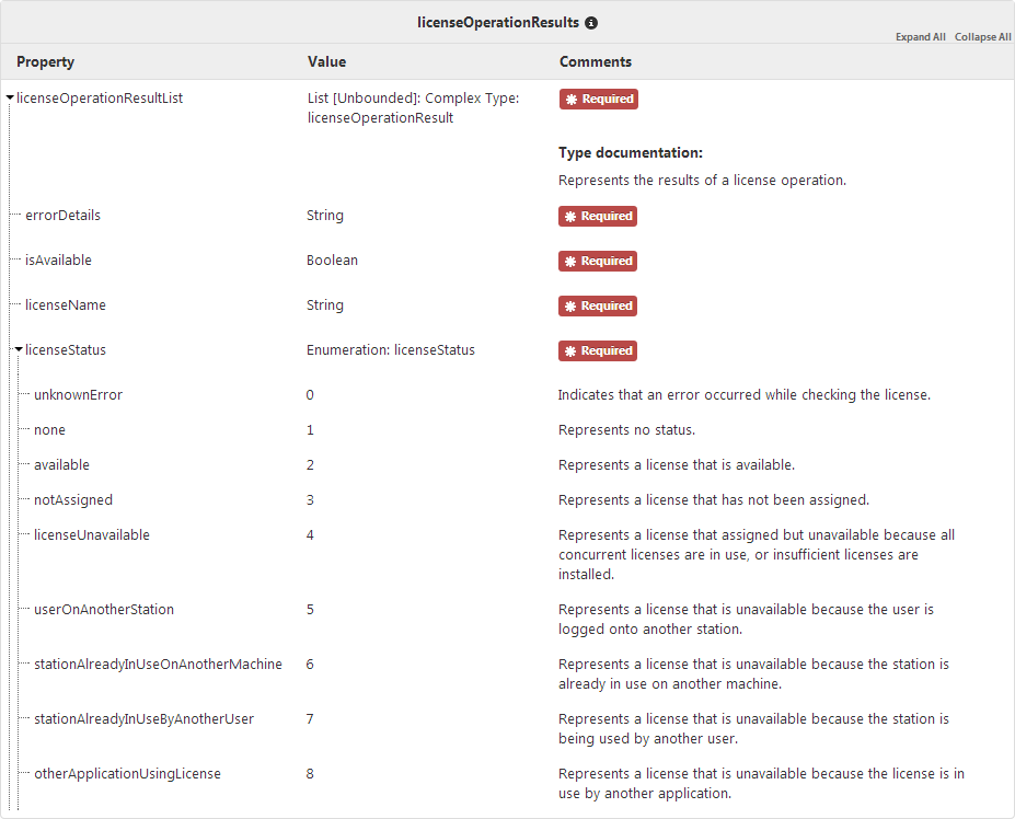 { "licenseOperationResultList": [ { "licenseName": "<License 1>", "isAvailable": true, "licenseStatus": 2, "errorDetails": "" } ] }