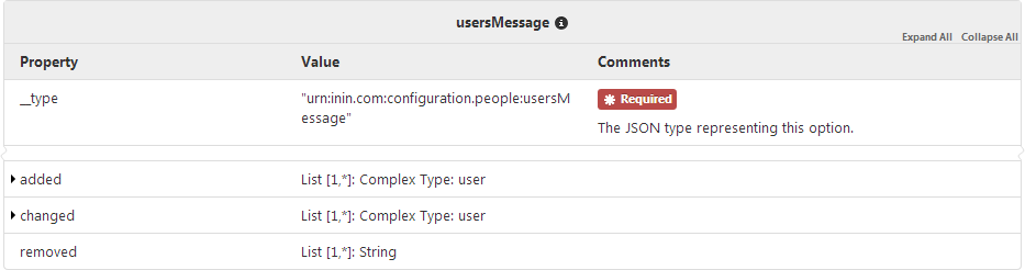 { "__type": "urn:inin.com:configuration.people:usersMessage", "isDelta": "true", "subscriptionId": "<subscription ID>", "added": [ { /* Contents of complex object 'user' removed for brevity. */ }, { /* Contents of complex object 'user' removed for brevity. */ }, { /* Contents of complex object 'user' removed for brevity. */ } ] "removed": [ "<removed user ID 1>", "<removed user ID 2>" ] }