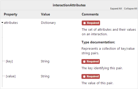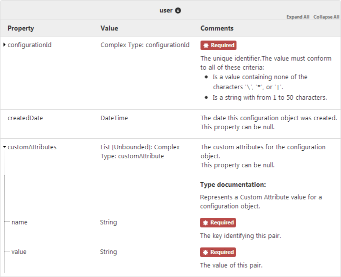 requests, responses, and messages have payloads described via "representation" objects. Representations are composed of properties, lists, dictionaries, and collections of properties (i.e. complex types). When a representation contains lists, dictionaries, or complex types, it is represented in the documentation as a collapsible tree of properties. This tree is a visual indication of the structure of the JSON