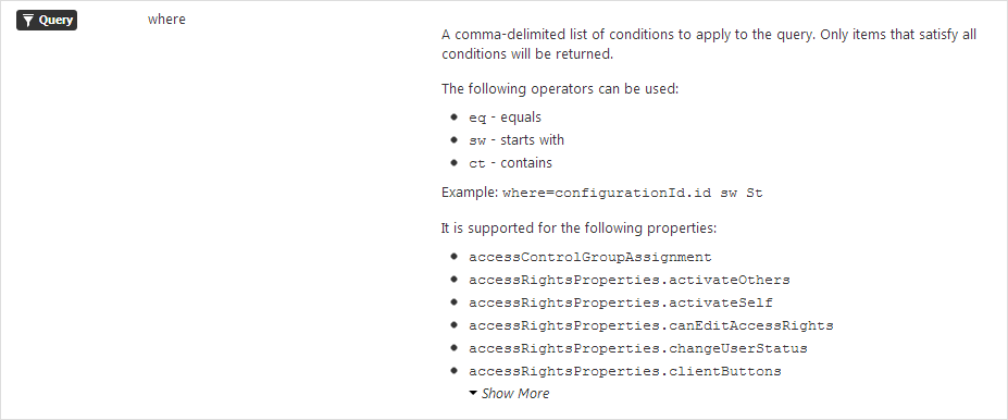 ![]() | If a representation contains a property that is required, dependent on the value of a different property, it will be indicated as conditionally required using this badge. For example, a property could only be required if a different property is either missing, or set to a specific value. For these cases, additional documentation on the properties will indicate the cases in which a property will be required or not. |