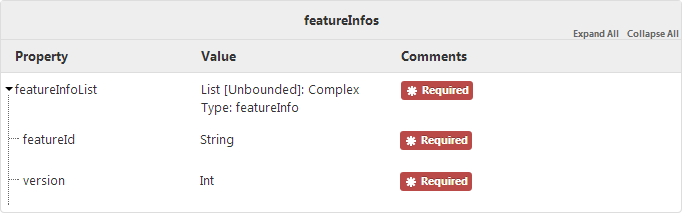 { "featureInfoList": [ { "featureId": "<Feature 1>", "version": "1" }, { "featureId": "<Feature 2>", "version": "5" }, { "featureId": "<Feature 3>", "version": "2" } ] }