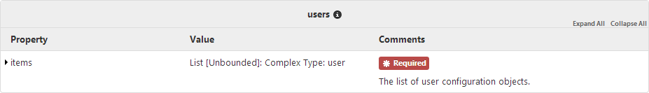 Some lists are "bounded" with a minimum and/or maximum number of items. The following example shows the documentation of "bounded" lists that will contain at least one item, followed by an example of the associated JSON array. (Note that some unrelated properties were removed from this image for brevity.) In this case the properties are not marked as