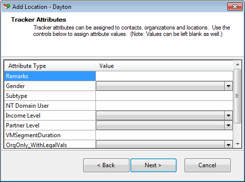 Dans la page Attributs Tracker, entrez les valeurs de tous les types d'attribut affichés et cliquez sur Suivant >.