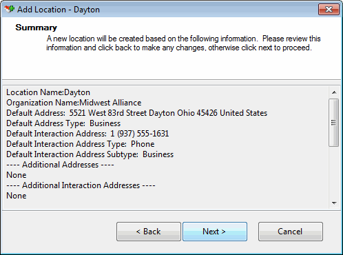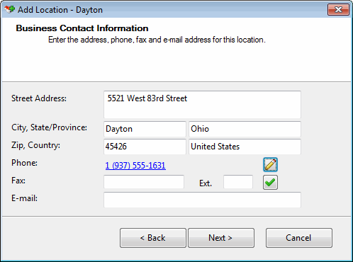 Vérifiez les entrées et cliquez sur Suivant > pour sauvegarder ces informations de localisation.