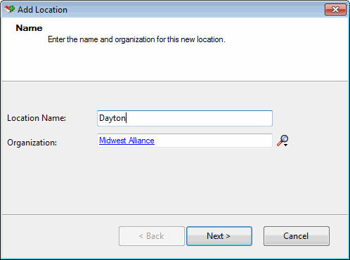 - Une fois le nom de l'emplacement et le nom de l'organisation spécifiés, cliquez sur Suivant.