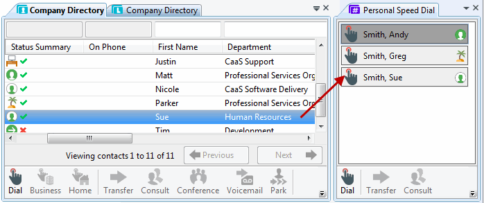 Pour ajouter un contact à une vue de numérotation rapide, sélectionnez le contact dans une vue de l'annuaire, puis faites-le glisser dans la vue de numérotation rapide. CIC sélectionne automatiquement la nouvelle entrée et la place dans le bon ordre.
