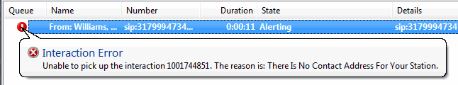 Une icône Interaction : Erreur s'affiche si vous ne parvenez pas à répondre à une interaction. Une info-bulle explique la raison de l'erreur. Contactez votre administrateur CIC pour vous aider à résoudre ce problème.
