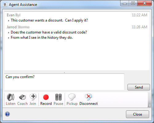Répondre ouvre la boîte de dialogue Répondre aux demandes d'aide pour fournir des commentaires et une assistance immédiate à l'utilisateur. Le superviseur peut discuter par sms avec l'agent et utiliser les contrôles des appels pour écouter, guider, participer, enregistrer, mettre en pause, répondre ou déconnecter l'appel.
