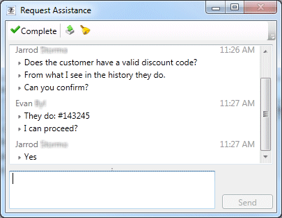 Lorsque vous cliquez sur le bouton Assistance dans Mes interactions ou dans la fenêtre Chat, la boîte de dialogue Demander de l'aide apparaît. Vous entrez la description du problème et cliquez sur Envoyer.