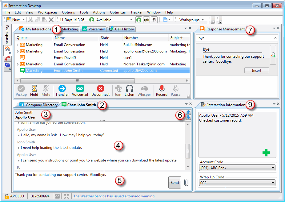 Le chat sélectionné dans Mes interactions détermine l'interaction de chat affichée dans la vue Chat. Astuce : pour basculer rapidement d'un chat à un autre dans Mes interactions, appuyez sur Ctrl+flèche vers le haut ou Ctrl+flèche vers le bas. Cela facilite la participation à plusieurs sessions de chat en même temps. |