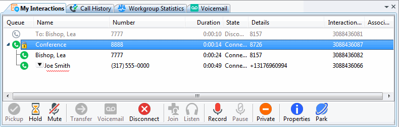 Les appels de conférence apparaissent dans les vues de file d'attente sous forme d'arborescence. L'appel de conférence est l'interaction de base. Cliquez sur la flèche en regard des interactions de base pour afficher ou masquer des participants à la conférence.