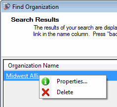 Dans la page Résultats de recherche de l'assistant Rechercher une organisation, cliquez avec le bouton droit sur le nom d'une organisation, puis sélectionnez Supprimer dans le menu de raccourcis.