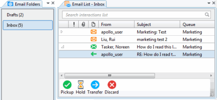 La liste des emails affiche les emails du dossier d'emails actuellement sélectionné. Si vous ne sélectionnez aucun dossier ou n'affichez pas la vue Dossiers des emails, la liste des emails affiche tous les messages de votre file d'attente (Mes interactions).