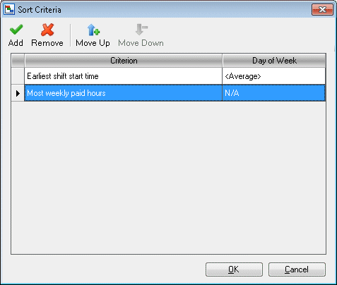 Cliquez sur l'icône Trier pour sélectionner des critères afin de classer automatiquement les calendriers disponibles. Les critères de tri sont honorés un par un dans l'ordre de priorité déterminé par l'ordre de la liste. Utilisez la barre d'outils de la boîte de dialogue Critères de tri pour définir vos critères de tri.