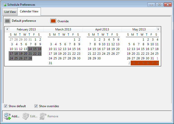 La vue Calendrier est un affichage graphique des préférences de calendrier par défaut et de remplacement. Les préférences par défaut et les préférences de remplacement sont mises en évidence dans les couleurs Préférence par défaut et Substitution indiquées.