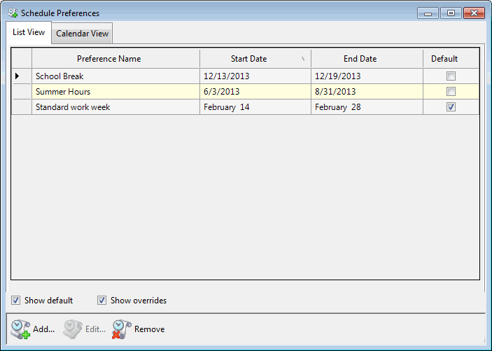 Astuce : dans l'une des deux vues, cochez la case Afficher les paramètres par défaut ou Afficher les substitutions pour afficher un seul type de préférence à la fois ou afficher toutes les préférences de planification en cochant les deux cases.