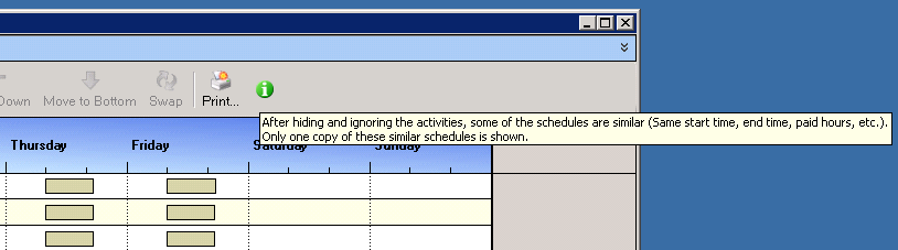 Les outils Jour et Semaine permettent de contrôler la façon dont les calendriers apparaissent dans cette partie de la fenêtre Calendriers d'offres. Basculez entre une vue détaillée ou synthétique de chaque période de travail dans les calendriers proposés. Remarque : l'exemple au début de cette rubrique est une vue Jour avec des activités affichées. Astuce : cliquez avec le bouton droit dans cette zone pour afficher un menu de raccourcis qui vous permet de basculer entre les vues, trier les calendriers, effectuer un zoom avant ou arrière, imprimer les informations actuellement affichées dans la boîte de dialogue de calendriers soumis à offre, et développer ou réduire tous les calendriers d'offres. En outre, vous pouvez sauvegarder vos paramètres d'affichage préférés en sélectionnant Réutiliser les derniers paramètres d'affichage des offres de calendrier dans le volet des détails des propriétés des paramètres Optimizer de la boîte de dialogue Configuration. Pour plus d'informations, consultez la rubrique Paramètres d'offres de calendrier Optimizer. |