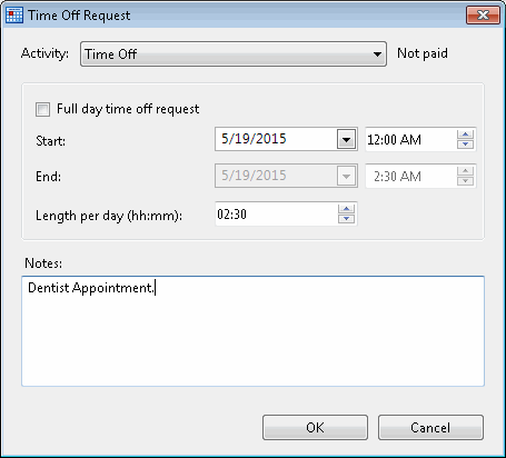 Vous pouvez également entrer une explication ou une autre description de la demande de congés dans la zone de texte Notes.
