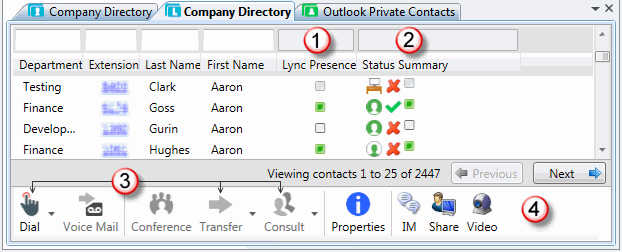 L'annuaire de la société avec Lync englobe les utilisateurs du client CIC et les utilisateurs du client CIC prenant en charge Lync dans une vue d'annuaire unifiée. Il comprend une barre d'outils conçue pour faciliter l'utilisation des fonctions de messagerie instantanée, de partage de bureau et de chat vidéo de l'intégration Lync.