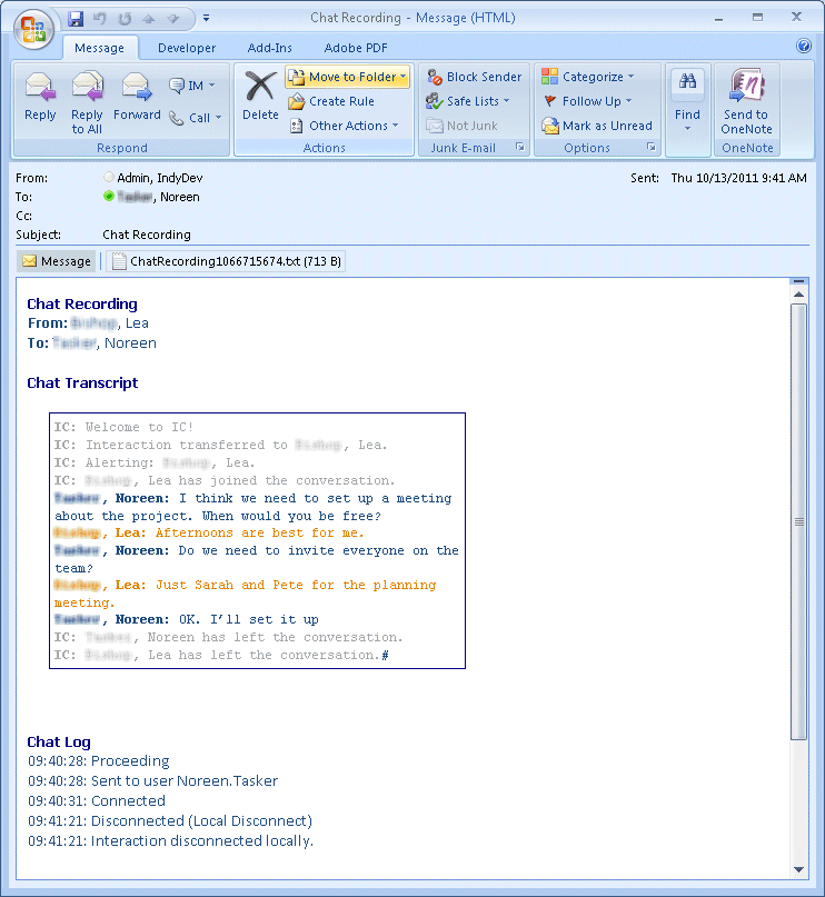 Sous réserve de disposer des licences et des droits appropriés, vous pouvez enregistrer une session de chat entre d'autres utilisateurs du client CIC (chat Intercom) ou entre vous et des participants à un chat distant (chat Web). L'enregistrement d'une session de chat crée une transcription du chat.