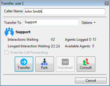 Remarque : avant de transférer un appel à un groupe de travail, vous devez disposer des droits appropriés attribués dans Interaction Administrator pour afficher le groupe de travail.