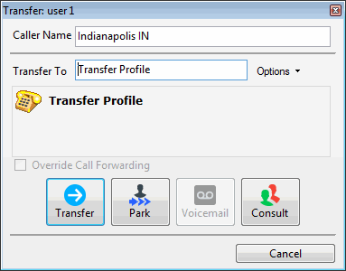 Avertissement : ne tentez pas un Transfert en double appel. L'utilisation d'un transfert de consultation vers un profil Attendant n'est pas prise en charge. Il se peut que l'appelant d'origine soit envoyé vers le profil Attendant par défaut, le menu IVR principal, plutôt que vers le profil sélectionné.