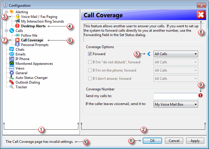 Les types de paramètres disponibles sont affichés sous forme d'arborescence sur la gauche. Cliquez sur un nœud pour afficher les paramètres de ce dernier. Remarque : la liste des nœuds change selon les plug-ins que votre administrateur CIC a activés et vos licences de fonction. Pour plus d'informations, consultez les liens d'aide dans les Options de configuration. |