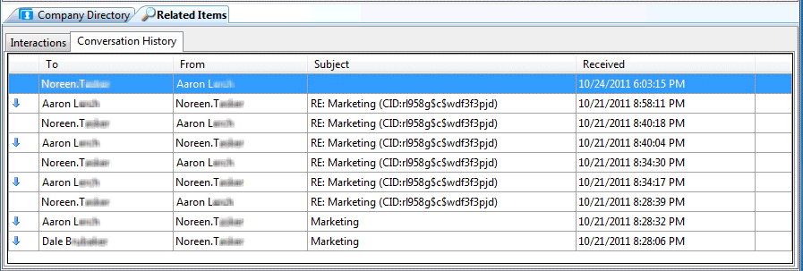 Résultat : l'onglet Historique de conversations affiche une liste des interactions par email associées à l'interaction par email sélectionnée.