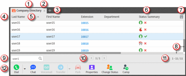 Utilisez la colonne Statut par défaut ou Résumé des statuts pour déterminer si un contact est disponible pour prendre un appel. Plusieurs autres colonnes de statut sont disponibles, notamment Notes sur le statut et Durée du statut. Pour plus d'informations, consultez la rubrique Personnalisation des colonnes. Astuce : pointez sur une icône dans la colonne Résumé des statuts pour afficher une info-bulle expliquant sa signification. Elle permet également d'afficher les informations Notes sur le statut et Jusqu'à date/heure, le cas échéant. Remarque : les annuaires généraux contiennent des contacts externes. Les informations sur le statut CIC ne sont pas disponibles pour les contacts externes. | |