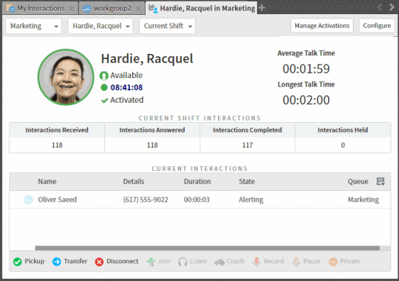Pour surveiller l'interaction d'un agent ou apporter votre aide, sélectionnez une interaction en cours et utilisez les boutons de la barre d'outils |