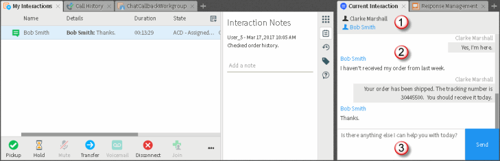 La vue Interaction actuelle affiche une conversation Chat. Vous pouvez utiliser la vue Interaction actuelle pour consulter la conversation et envoyer des messages aux autres participants du chat.