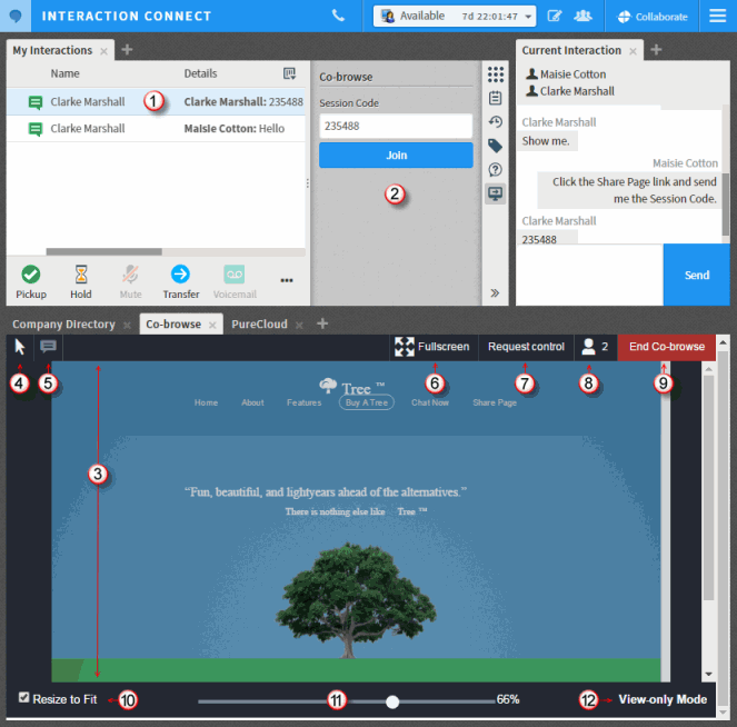 Vous rejoignez une session de co-navigation en cliquant sur le bouton de la barre latérale de co-navigation une fois qu'un visiteur du site Web de votre société vous fournit un code de session de co-navigation. Pour plus d'informations, consultez la rubrique Utilisation de la fonction de co-navigation au cours d'une interaction.