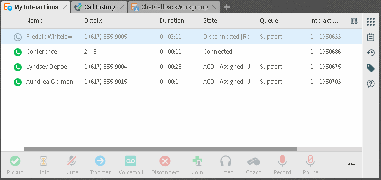 Les appels de conférence apparaissent dans les vues de file d'attente sous forme d'arborescence. L'appel de conférence est l'interaction de base. Cliquez sur la flèche en regard des interactions de base pour afficher ou masquer des participants à la conférence.