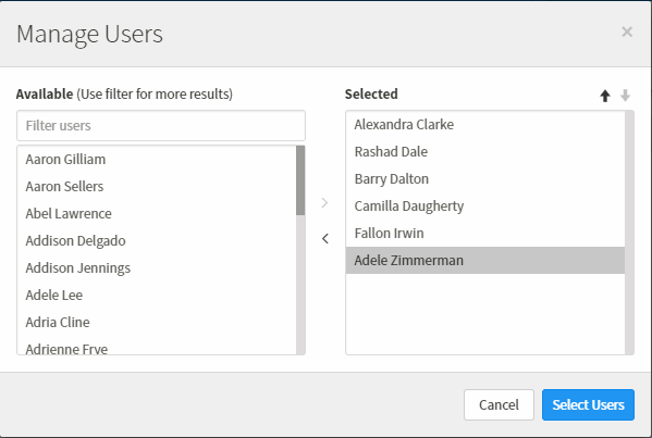 Lorsque la liste Sélectionnés contient les noms des files d'attente d'utilisateurs à surveiller, cliquez sur Sélectionner des utilisateurs.