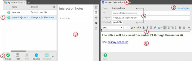 L'interaction par email actuellement sélectionnée apparaît dans la vue Interaction actuelle. Utilisez cette vue pour prévisualiser le contenu d'une interaction entrante sans y répondre. Vous pouvez également composer des emails ou des réponses à des interactions par email dans cette vue.