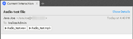 Les fichiers joints à l'interaction par email apparaissent ici. Selon le navigateur que vous utilisez, vous pouvez cliquer sur la pièce jointe pour la télécharger, l'ouvrir ou la sauvegarder. Remarque : si votre navigateur prend en charge la lecture d'un type particulier de fichier audio, un bouton Lire apparaît à la place de l'icône du type de fichier. Cliquez sur Lire pour lire le fichier audio complet. Pendant la lecture, un bouton Arrêter remplace le bouton Lire. |
