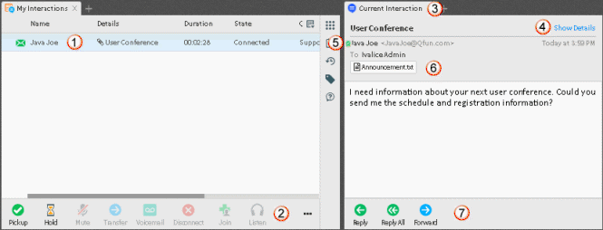 Lorsque vous sélectionnez un email dans Mes interactions, elle apparaît dans la vue Interaction actuelle. |