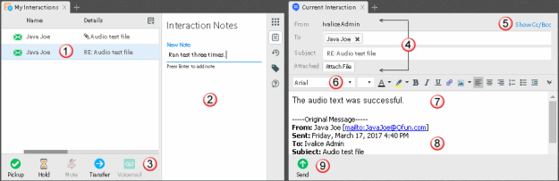 Lorsque vous sélectionnez une réponse ou un email transféré dans Mes interactions, l'option Envoyer est disponible dans la barre d'outils de la vue Interaction actuelle. |