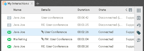 Une icône d'email identifie une interaction par email. La réponse à une interaction acheminée par ACD est liée à l'email d'origine et apparaît sur la ligne suivante.