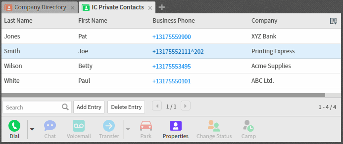 lorsque vous disposez des droits appropriés, comme dans l'annuaire de Contacts privés IC, vous pouvez insérer et supprimer des entrées d'annuaire.