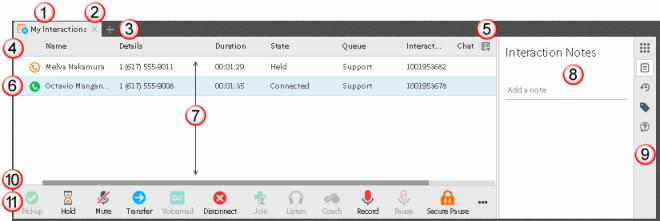La barre latérale Mes interactions peut afficher le pavé de numérotation, les notes d'interaction, les journaux d'interactions, les propriétés d'interactions ou une demande d'assistance. |