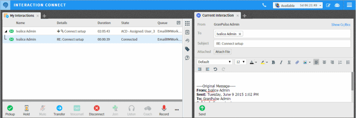 Après avoir envoyé l'email de réponse, sélectionnez l'interaction par email d'origine dans Mes interactions et cliquez sur Déconnecter.