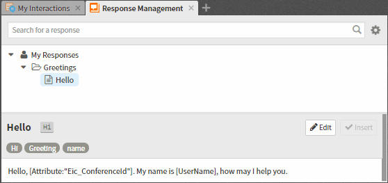 L'Éditeur de gestion des réponses contient des commandes de navigation et de modification de texte. Pour plus d'informations sur la création ou la modification de réponses personnelles, consultez la rubrique Création de réponses personnelles.