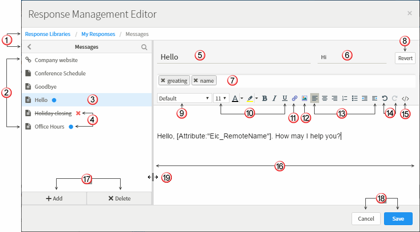 Pour créer et modifier des éléments de réponse, utilisez l'éditeur de gestion des réponses. Il s'agit d'un éditeur HTML complet avec des outils de formatage du texte pour les messages. Vous pouvez insérer des macros de réponse, créer des liens hypertextes et ajouter des images.