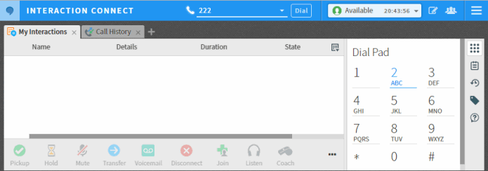 La barre latérale Mes interactions vous permet d'afficher le pavé de numérotation, les notes d'interaction ou le journal de l'interaction. Vous pouvez également attribuer des codes de compte et de conclusion à des interactions et demander l'aide de votre superviseur. Pour choisir ce qui s'affiche dans la barre latérale, cliquez sur la commande appropriée sur le bord droit de la zone de barre latérale.