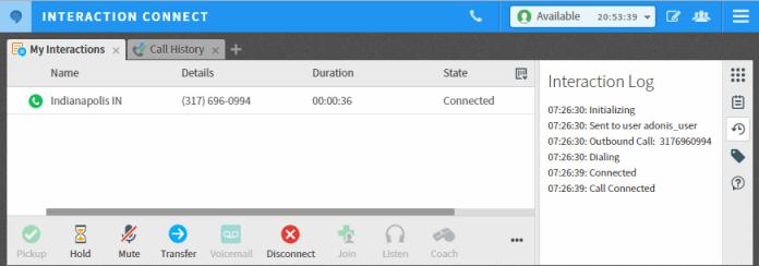 La barre latérale Journal de l'interaction affiche les détails de connexion et d'acheminement pour l'interaction sélectionnée.
