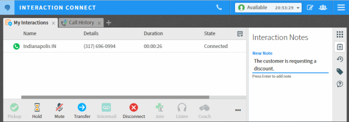 Sélectionnez une interaction connectée et prenez des notes dans la barre latérale Notes d'interaction. Cliquez sur le signe plus pour ajouter une note à l'interaction.