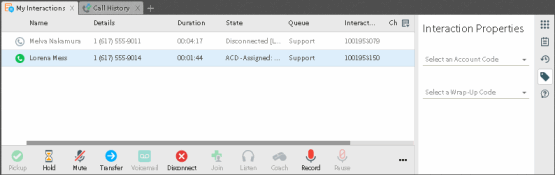 Sélectionnez une interaction et attribuez-lui un code de compte ou un code de conclusion. Les codes de compte sont parfois utilisés pour facturer les clients. Pour attribuer un code de conclusion, vous devez être membre d'un groupe de travail pour lequel l'administrateur CIC a configuré et activé les codes de conclusion.