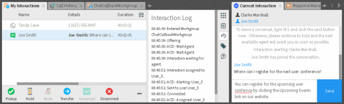 Lorsque CIC achemine des SMS en tant que chats, vous interagissez avec eux exactement comme vous le feriez pour tout autre chat. Toutes les fonctionnalités disponibles lors du traitement d'un chat sont accessibles pendant le traitement de ces SMS. Vous pouvez inviter d'autres utilisateurs de CIC à se joindre à la conversation par SMS, utiliser la gestion des réponses pour rechercher les réponses aux questions fréquemment posées, ajouter des notes ou des codes, etc. Pour plus d'informations, consultez la rubrique Gestion d'une session de chat.
