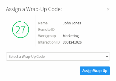 Remarque : si un superviseur attribue un code de conclusion à l'interaction alors que l'invite de code de conclusion s'affiche, le code venant d'être sélectionné apparaît dans la liste déroulante Code de conclusion. Vous ne pouvez pas modifier ce code depuis l'invite. Vous pouvez toutefois le modifier, le cas échéant, dans la barre latérale Propriétés de l'interaction. Vous pouvez alors fermer la boîte de dialogue Attribuer un code de conclusion ou attendre que la boîte de dialogue se ferme automatiquement lorsque la limite de temps de conclusion est atteinte.